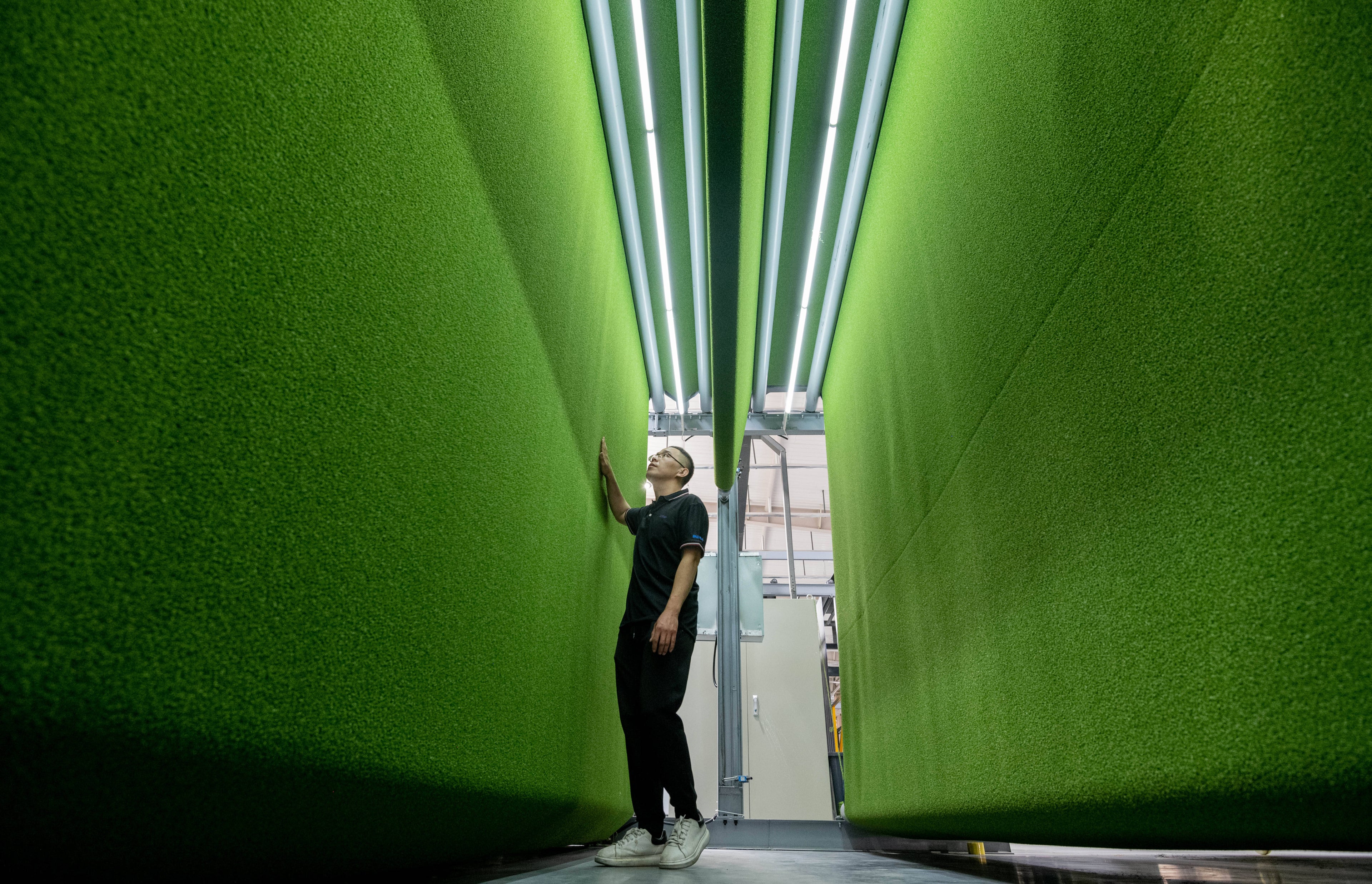 The cured turf undergoes refinement to enhance its quality. First, "shearing" is performed using large blades to trim the tips of the fibers to a uniform height. Next, "fibrillation" is carried out on flat fibers, where specialized brush rollers or blades split them longitudinally to create a more realistic, lush, mesh-like blade structure. For sports turf, perforation may also be added to improve drainage. These treatments significantly improve the final appearance and texture of the turf.