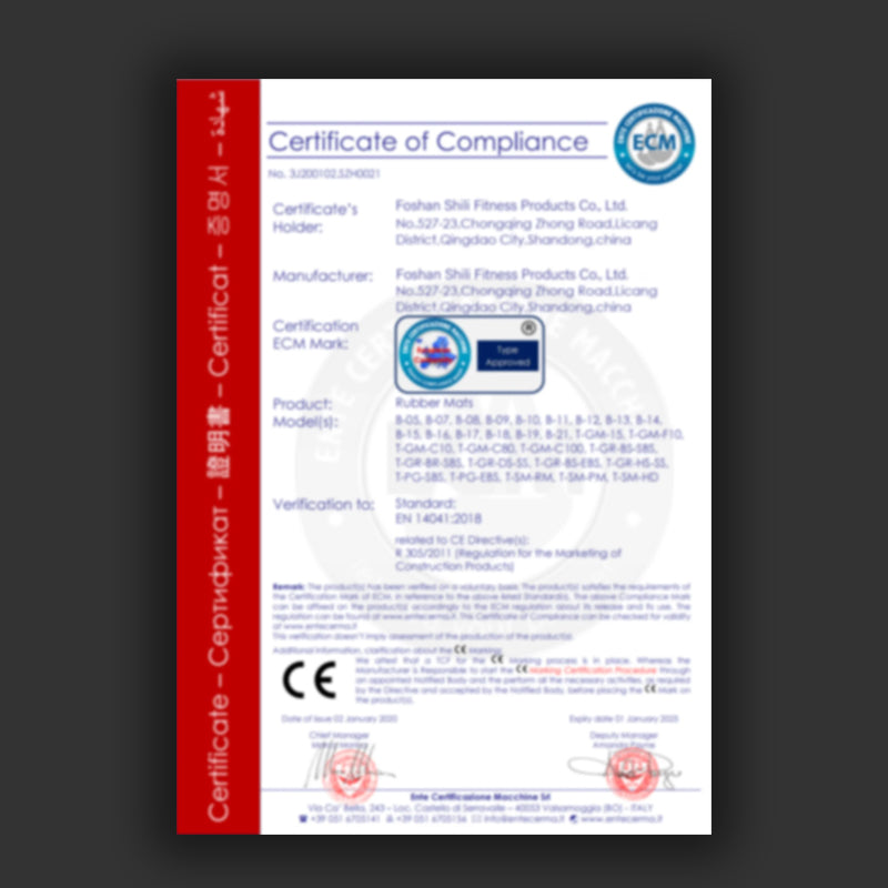 To ensure optimal performance and safety, all our gym turf products are tested and certified with CE, REACH, RoHS, and EN 13501-1 fire resistance standards.