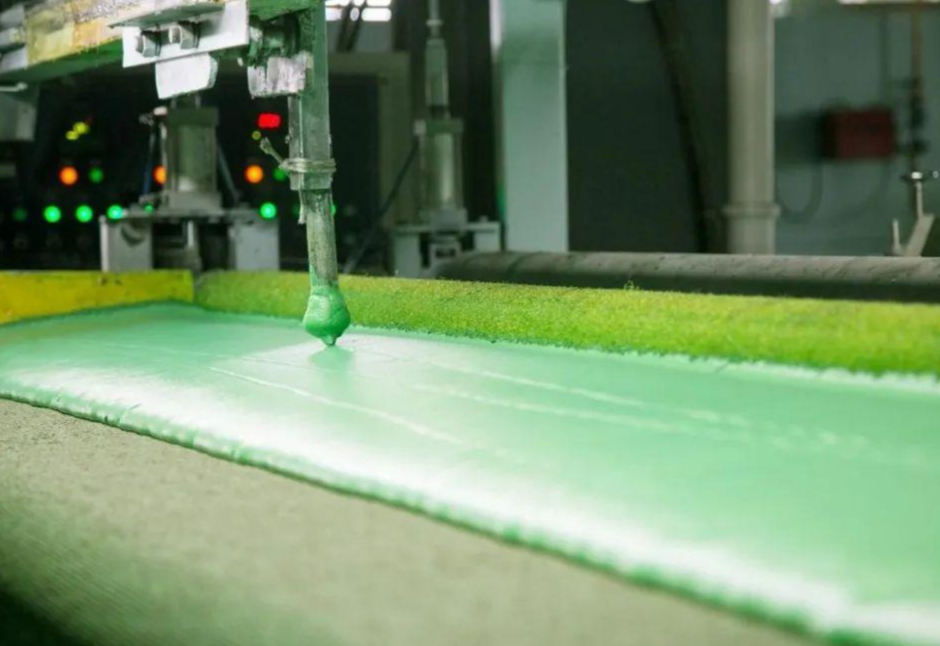 On the back of the tufted turf, a layer of liquid backing adhesive (commonly SBR latex or polyurethane PU) is evenly applied. The adhesive penetrates to the roots of the grass clusters, firmly bonding them to the backing fabric to prevent the fibers from being pulled out during use. The turf then passes through a temperature-controlled drying tunnel, where the adhesive is fully dried, vulcanized, and cured to form a stable base layer. This step is a core part of ensuring the structural stability and service life of the turf.