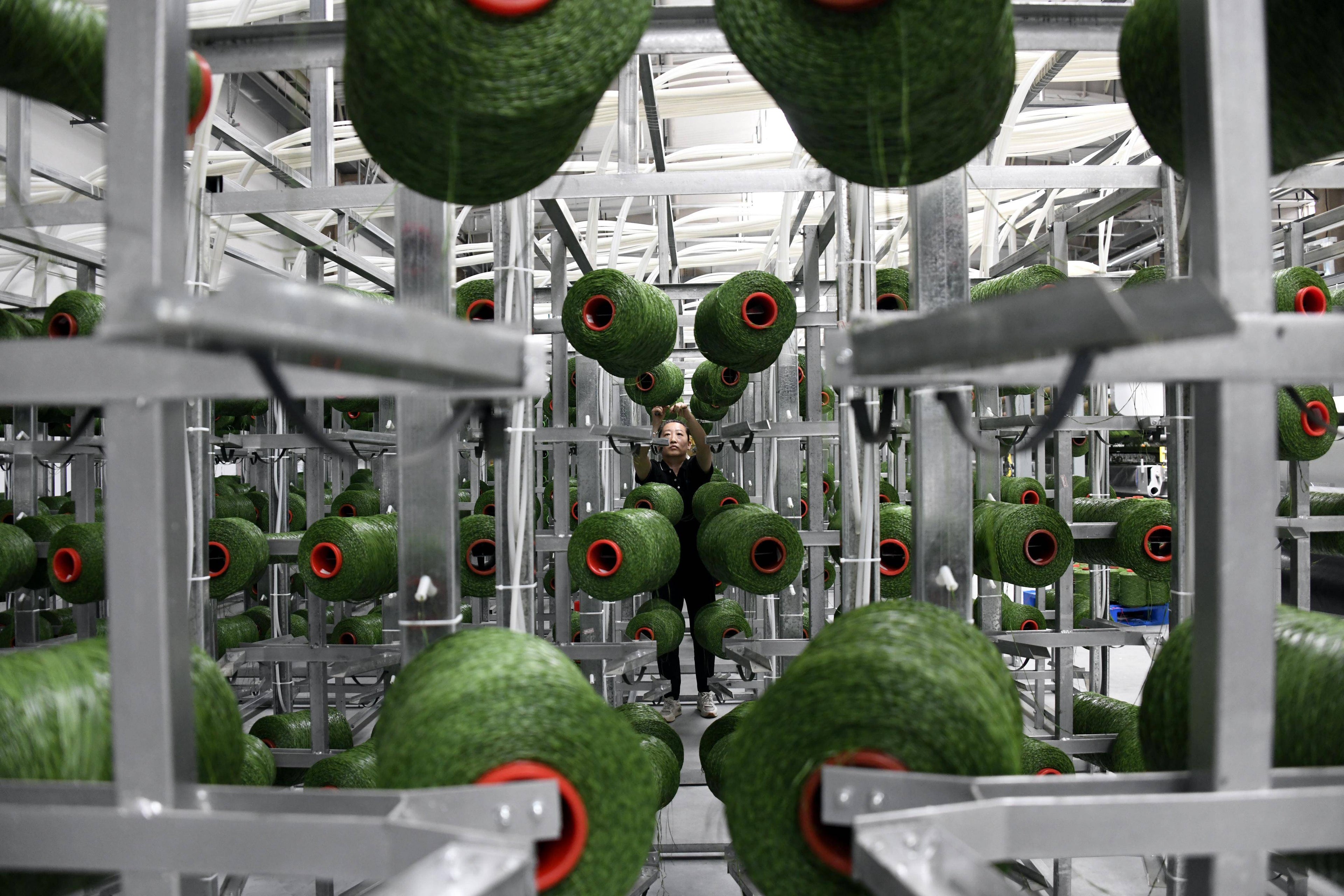 The molten plastic mixture is extruded through a "spinneret" with precise micro-holes to form continuous filaments. The newly extruded fibers are immediately cooled and set, then undergo multiple stretching (drawing) processes to enhance their strength, toughness, and tensile properties. Depending on the product design, the fibers can be processed into a flat shape or made into a "fibrillated" yarn (one-step process) that mimics natural grass through special dies. Finally, the formed fibers are neatly wound onto large spools, ready for the next tufting stage.